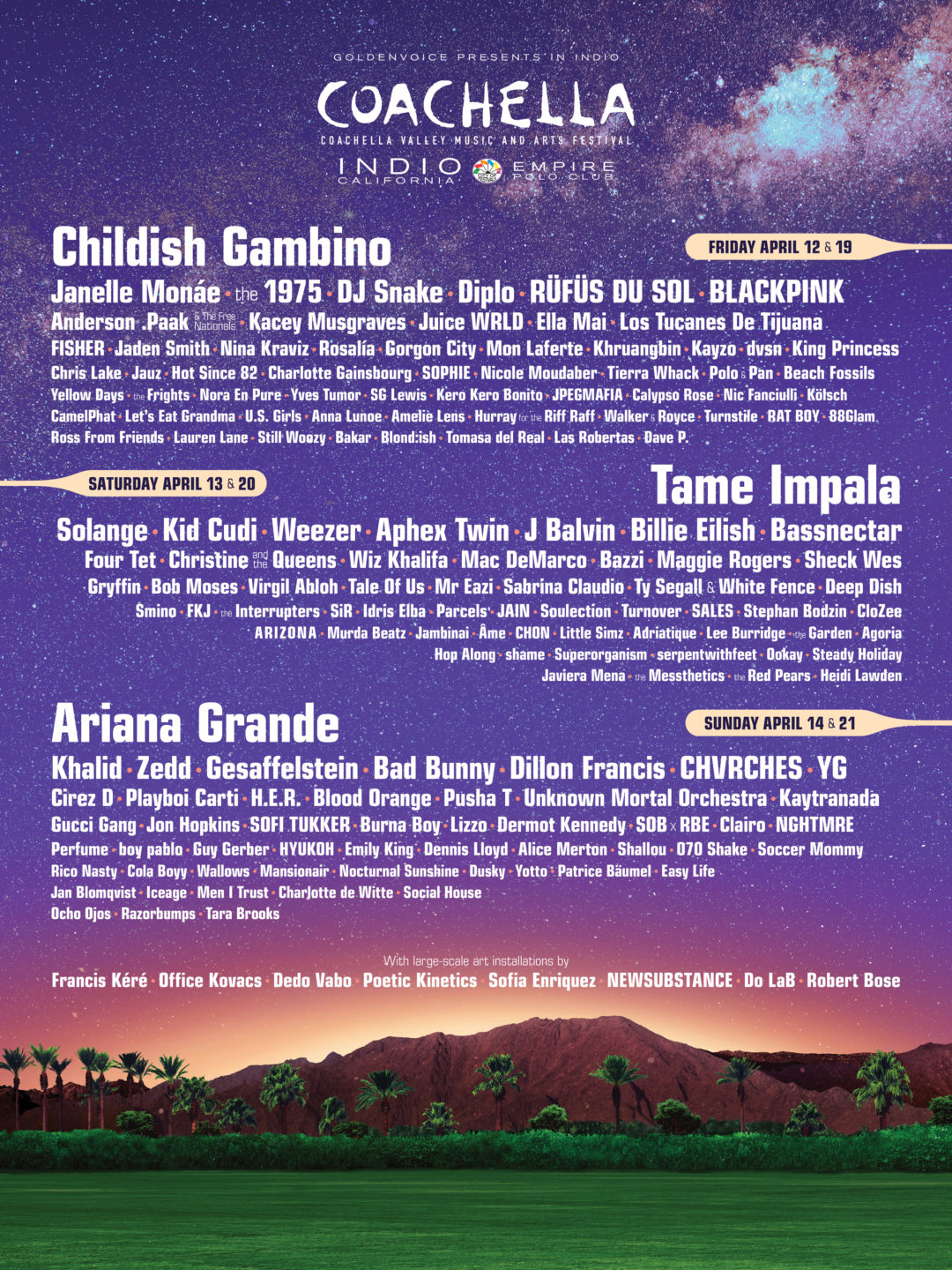 Los Angeles Coachella returns to the Empire Polo Club in Indio California. It might feel too early to start planning for festival season but Coachella has just revealed its 2019 lineup and youre probably going to want ticketsThe two-weekend festival will take place on April 12 13 and 14 and then again on April 19 20 and 21 with Childish Gambino as the Friday night headliner Tame Impala for Saturday and Ariana Grande as Sundays headliner. Childish Gambino Tame Impala Ariana Grande Headline Coachella 2019.