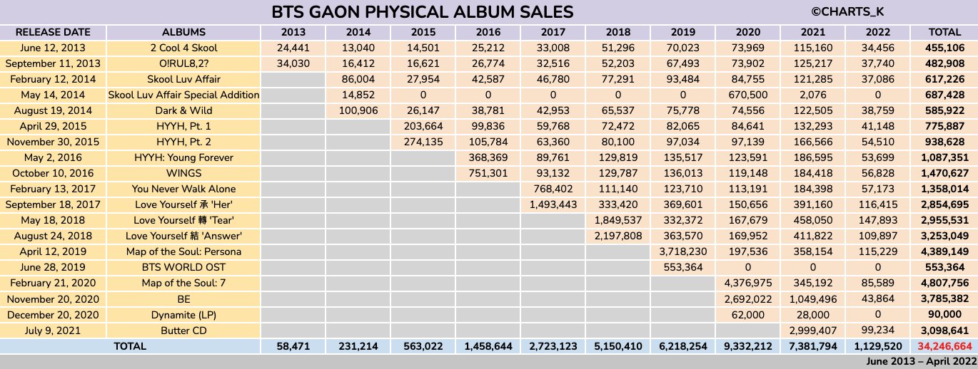 Bts Charts Translations On Twitter Bts Gaon Physical Album Sales Jun 2013 Jan 2020 2013 58 471 2014 231 214 2015 563 022 2016 1 458 644 2017 2 723 123 2018 5 150 410 2019 6 218 434 2020 148 131 Total