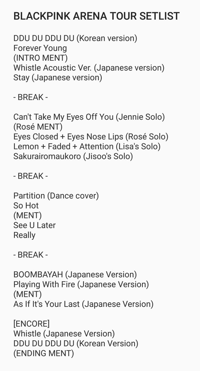 View average setlists openers closers and encores of BLACKPINK for the tour BLACKPINK Japan Arena Tour 2018. BLACKPINK Japan Arena Tour 2018 8 BLACKPINK Japan Premium Debut Showcase 1 BLACKPINK World Tour IN YOUR AREA 38 THE SHOW 1 Songs. Listen free to BLACKPINK BLACKPINK ARENA TOUR 2018.