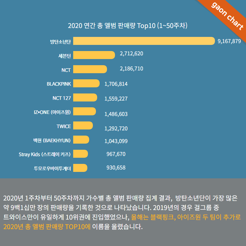 Korean Sales On Twitter Best Selling Artists In 2020 01 Bts 9 167 879 02 Seventeen 2 712 620 03 Nct 2 186 710 04 Blackpink 1 706 814 05 Nct127 1 559 227 06 Izone 1 486 603 07 Twice 1 292 720 08 Baekhyun 967 670 09 Straykids 967 670